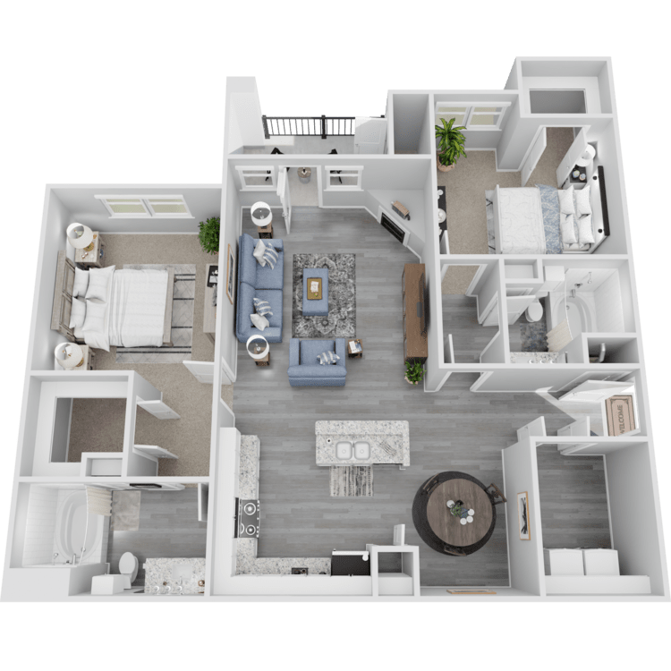 Select from six floor plans with one, two, or three-bedroom apartments for rent. Each residence includes ceiling fans, carpeted and hardwood floors, an electric fireplace, a garden tub, walk-in closets, extra storage, washer and dryer connections, and a balcony or a patio. The kitchen features a microwave, dishwasher, pantry, and breakfast bar. Ask about corporate housing.